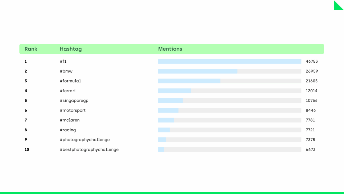 Hashtags emergentes como #BMW (vinculado a debates sobre autos eléctricos) y #PhotographyChallenge muestran cómo el contenido de F1 trasciende el deporte, mezclándose con tendencias de estilo de vida y visuales en Instagram y TikTok.