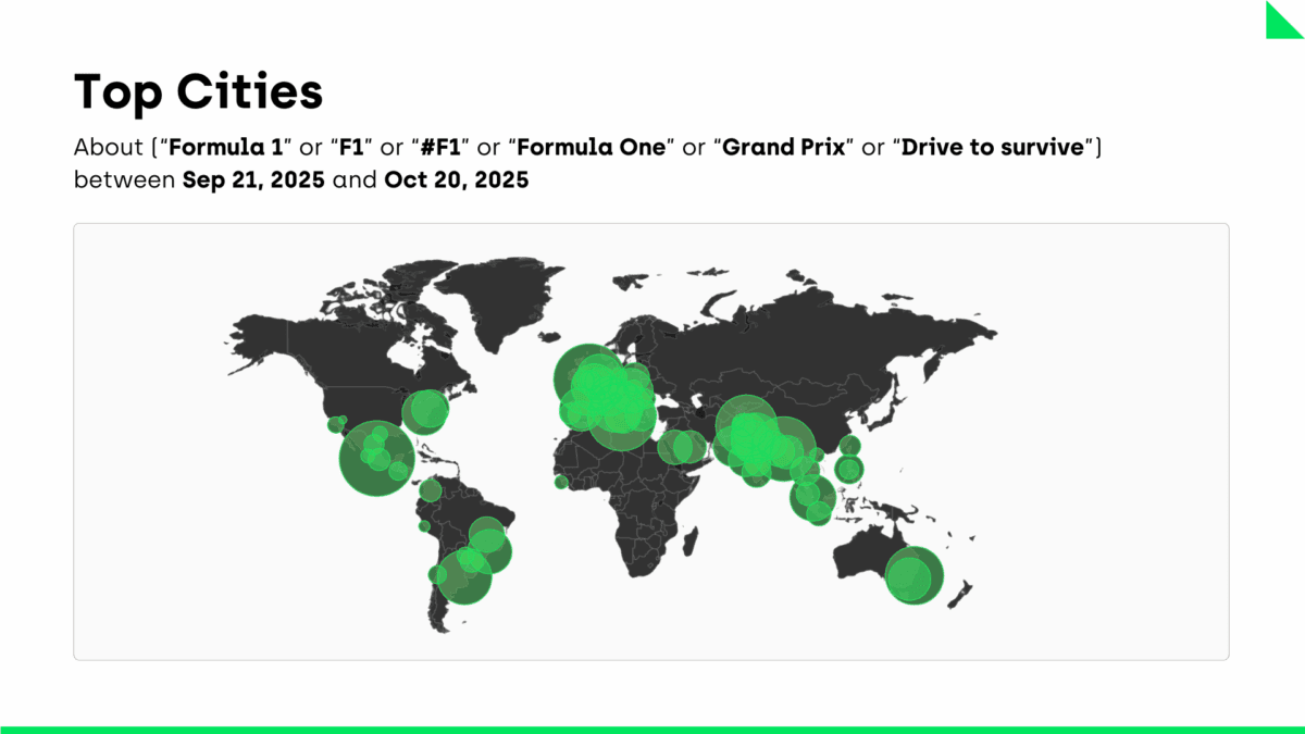 - Ciudades como Ciudad de México, Londres y Buenos Aires aparecen como hubs activos, demostrando que el pulso digital de F1 es tan rápido como sus autos.