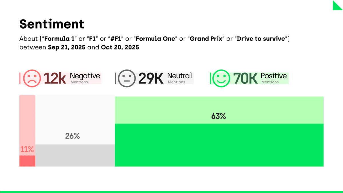 El sentimiento se mantiene mayormente positivo (63%), reflejando cómo F1 pasó de deporte de nicho a plataforma global de storytelling que inspira entusiasmo y lealtad de marca.