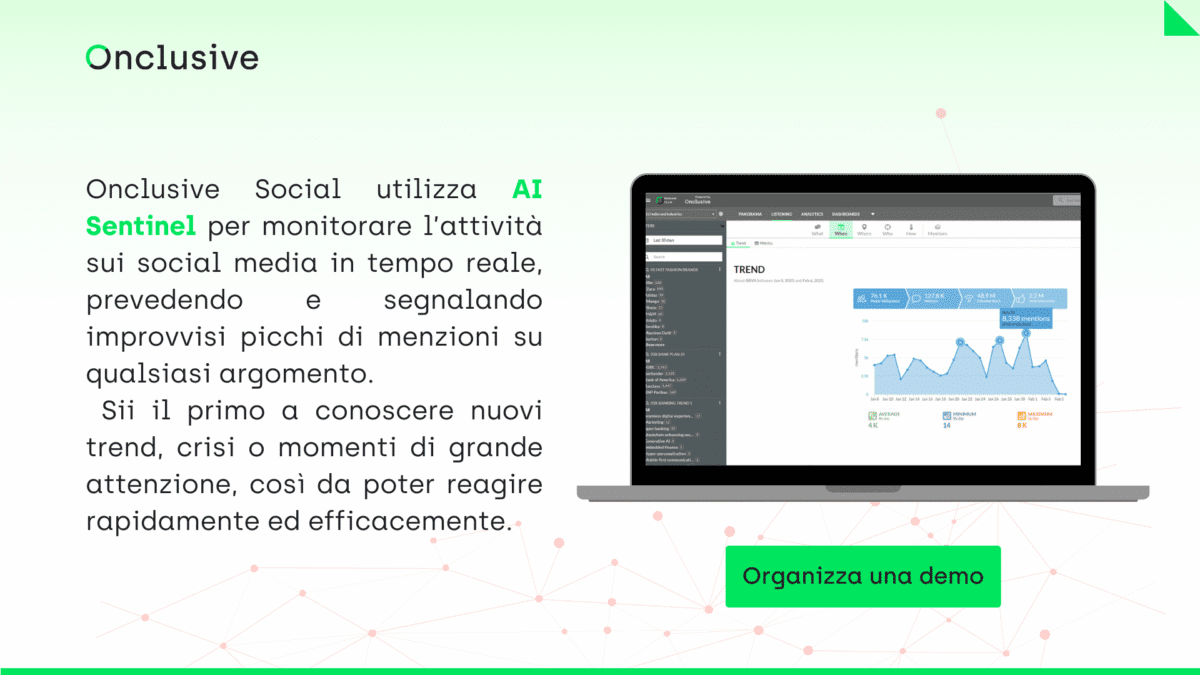 Infine, ricorda che gli strumenti di social listening, per quanto potenti, non fanno tutto il lavoro. Ti forniscono dati e analisi, ma dipende da te trasformarli in azioni concrete che miglioreranno la tua organizzazione. Il successo nel social listening dipende tanto dalla tecnologia quanto dalle persone che la usano e dai processi che consentono di tradurre gli insight in decisioni e azioni.