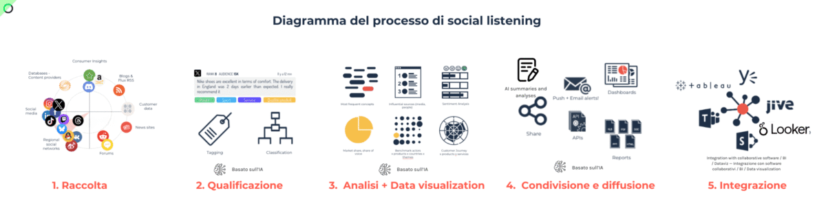 Per comprendere gli strumenti di social listening, dobbiamo esaminare le loro fasi distinte ma interconnesse. Inoltre, esploreremo come l’IA rivoluziona ogni fase.