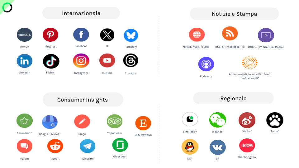 Un aspetto spesso sottovalutato ma assolutamente cruciale degli strumenti di social listening riguarda l’estensione delle fonti che possono monitorare. Molti pensano erroneamente che il social listening sia limitato ai principali social network come Facebook, Instagram o quello che era precedentemente Twitter (X). In realtà, gli strumenti completi di social listening devono coprire uno spettro molto più ampio.
