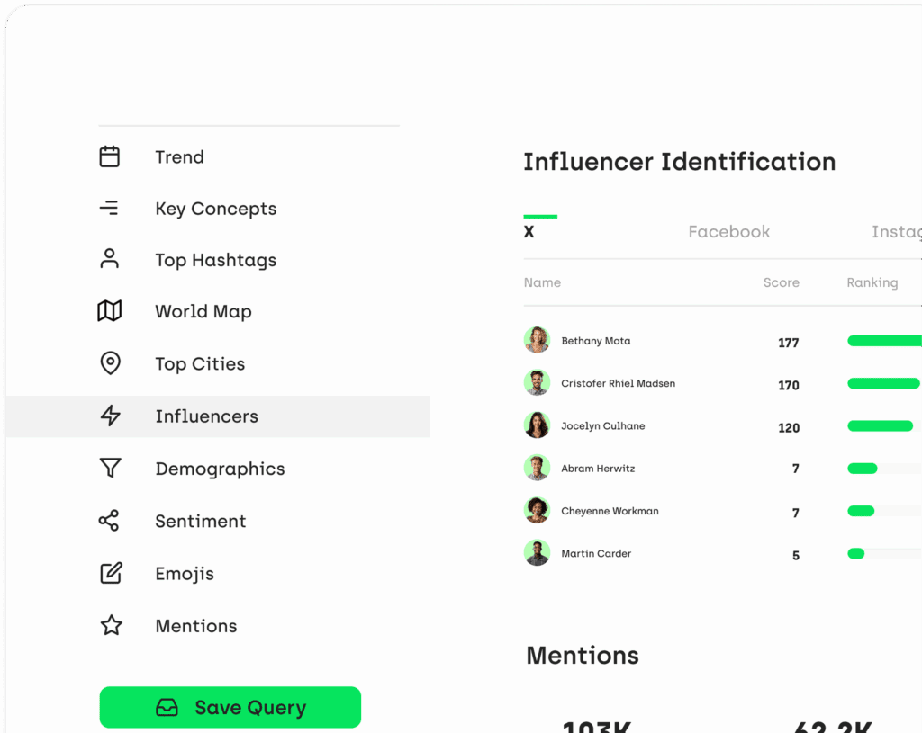 - Determina la autoridad social comparando los principales líderes de opinión en función de la ubicación, el alcance, el engagement en el mercado y la afinidad con la marca.