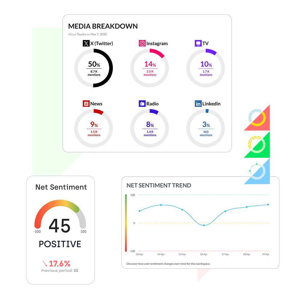 - Rastrea menciones de marca, tendencias del sector y la actividad de la competencia en canales sociales y digitales.